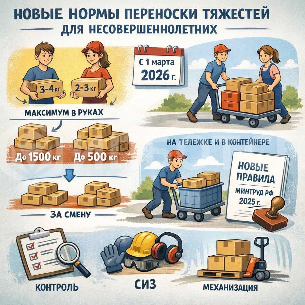 С 1 марта 2026 года вступили в силу новые предельные нормы переноски и передвижения тяжестей для несовершеннолетних работников. Они утверждены приказом Минтруда России от 10.06.2025 г. №369н и будут действовать до 1 марта 2032 года. Документ заменил устаревшее постановление Минтруда от 07.04.1999 г. №7.