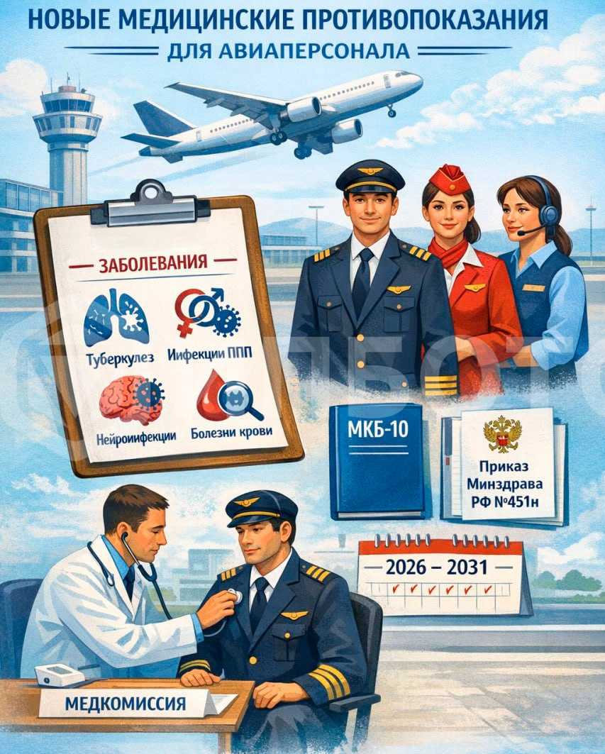 С 1 марта 2026 года вступил в силу новый перечень медицинских противопоказаний для авиационного персонала гражданской авиации. Он утвержден приказом Минздрава России от 24.07.2025 г. №451н. Документ действует до 1 марта 2031 года.