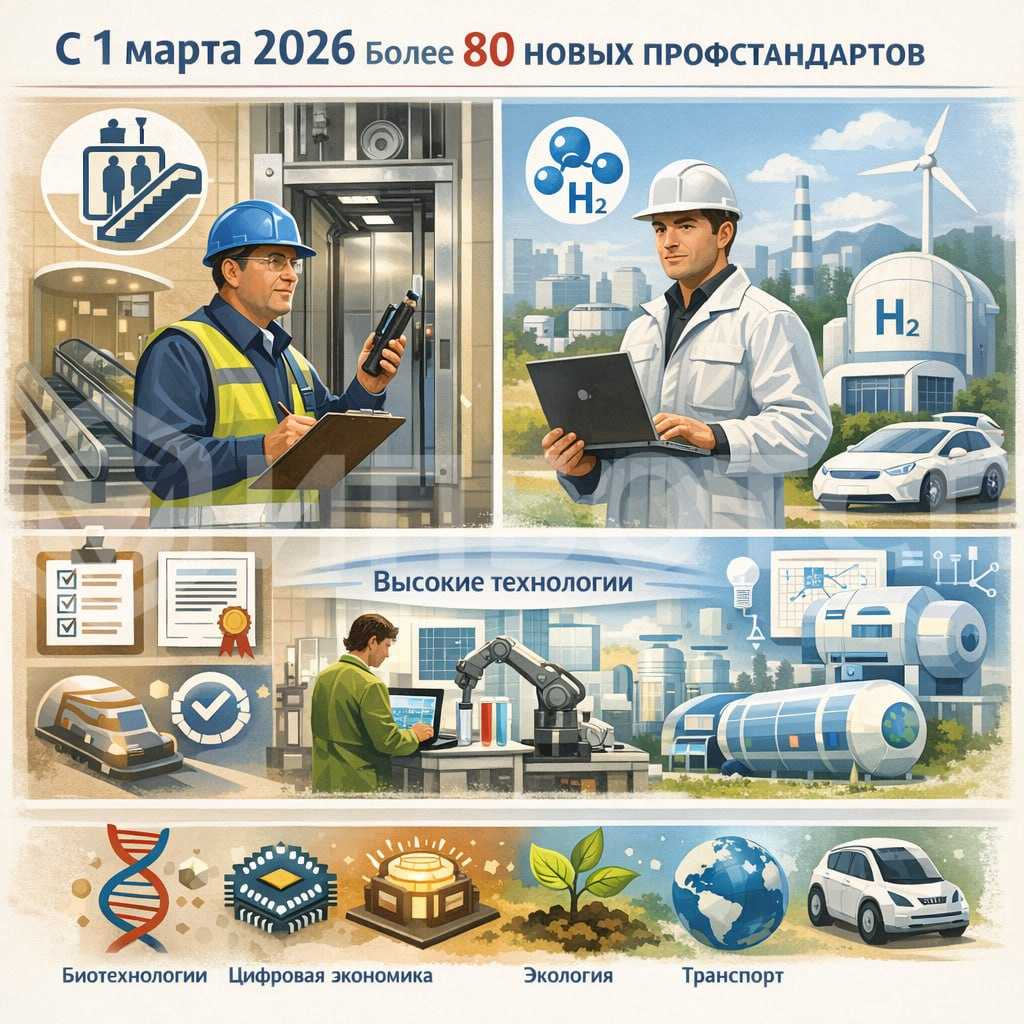 С 1 марта 2026 года вступили в силу более 80 новых профессиональных стандартов, утвержденных приказами Минтруда России. Среди них – стандарты для специалистов по оценке безопасности лифтов и эскалаторов, разработчиков водородных энергоустановок и других профессий, связанных с высокотехнологичными и перспективными направлениями деятельности.